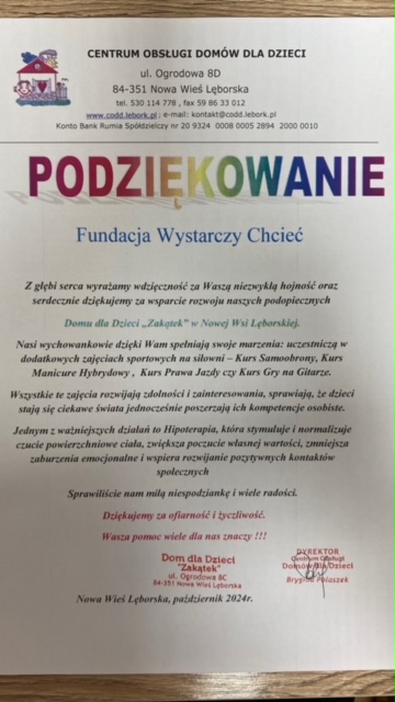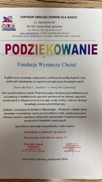 Fundacja Wystarczy Chcieć. Skladamy wyrazy ogromnej wdzięczności Fundacji Wystarczy Chcieć,która wsparła naszych wychowanków Domu dla Dzieci "Siedlisko" i "Zakątek" w realizacji marzeń i rozwoju osobistego. Fundacja Wystarczy Chcieć sfinansowała w DdD "Siedlisko": 1. Korepetycje przedmiotowe z j.angielskiego i matematyki 2. Hipoterapię - Weekend w Siodle przez okres 6-mcy 3. zajęcia na siłowni 4. zajęcia w Ekopracowni. Wsparcie w wysokości 35.000 zł. W DdD "Zakątek: 1. kurs prawa jazdy 2. Kurs samoobrony 3. nauka gry na gitarze 4. kurs Manicure Hybrydowy 5. kurs jazdy konno przez 6 m-cy . Wsparcie w wysokości 38.000 zł. Dziękujemy za Wasze Serce .